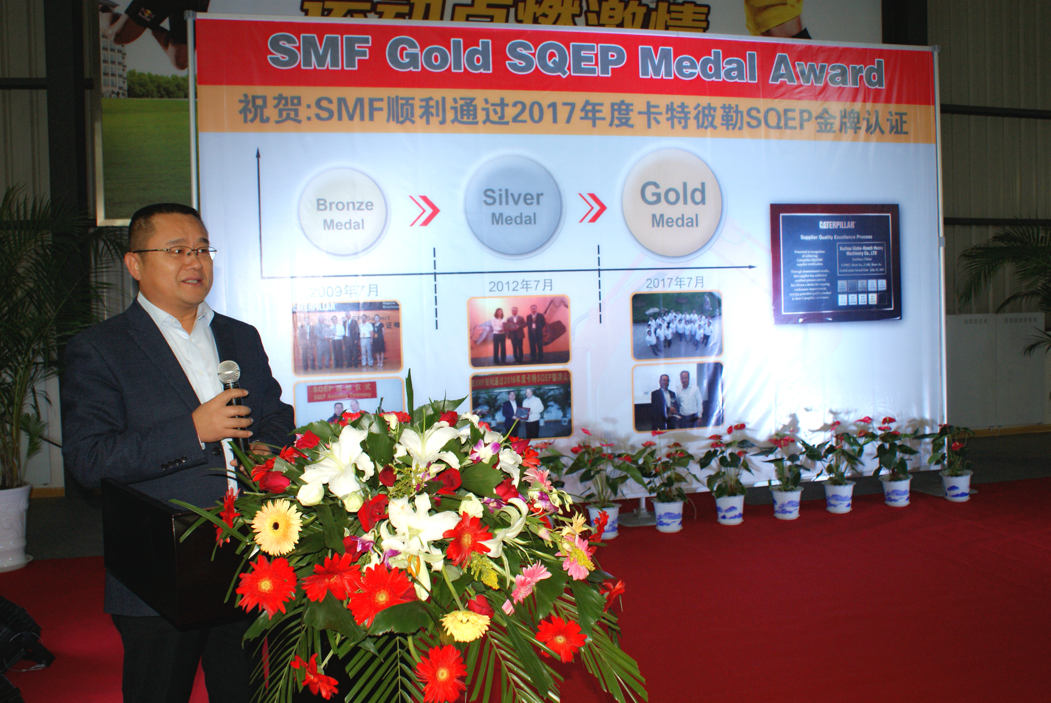 2017年10月12日,SMF在職工活動中心隆重舉辦卡特彼勒SQEP金牌供應商授牌儀式,卡特彼勒全球采購部亞太區采購經理李志鋒一行來我司進行授牌,現場氣氛十分活躍。授牌儀式由副總經理李總主持,總經理薛總作重要講話,感謝卡特彼勒對我司的認可與信任,今后我司將再接再厲,用更好的質量和服務回饋客戶,加強與卡特彼勒之間的緊密合作,爭取獲得長足發展。李志鋒先生表示對我司寄予厚望,希望我司能在結構件制造領域邁上一個新的臺階。
