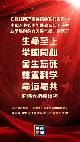 習近平:在這場同嚴重疫情的殊死較量中,中國人民和中華民族以敢于斗爭、敢于勝利的大無畏氣概,鑄就了生命至上、舉國同心、舍生忘死、尊重科學、命運與共的偉大抗疫精神。